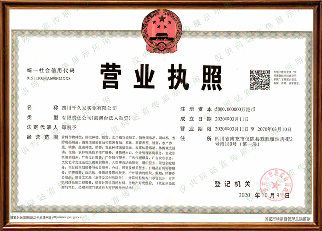 四川千久發實業有限公司為香港中南海集團旗下全資子公司,主營調味品、發酵制品、食用植物油生產、加工、銷售;預包裝食品兼散裝食品銷售;生物藥品銷售;農業觀光旅游,住宿服務。我們傾力打造生態農業基地,現有花椒基地近萬畝,位于朱德故里四川省儀隴縣雙勝鎮,獨特的地理條件和自然氣候非常有利于九葉青花椒的種植和生長。