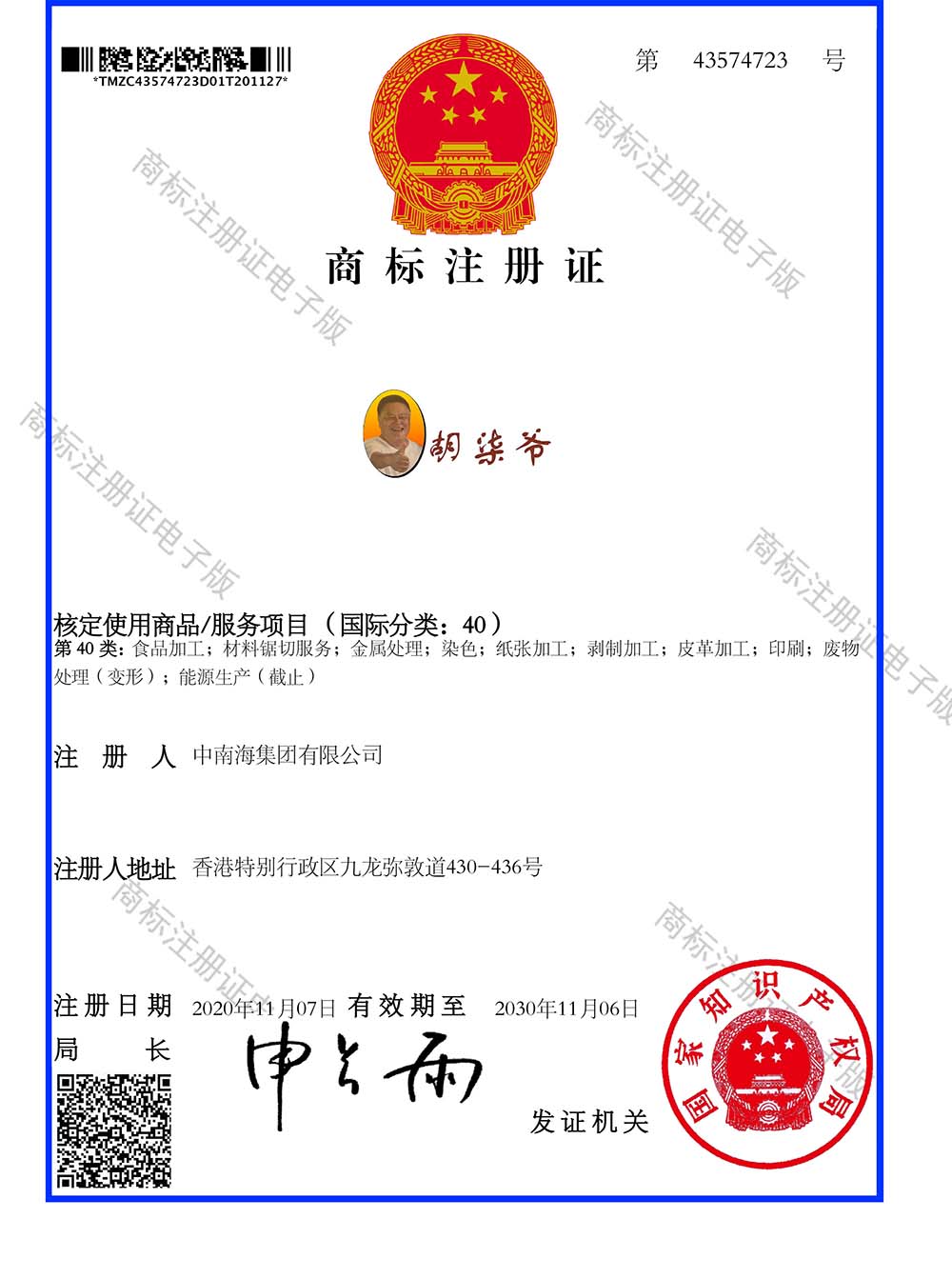 熱烈祝賀中南海集團有限公司商標經(jīng)過國家知識產(chǎn)權局商標局的受理、初審、公審等一系列法定程序,商標“胡柒爺+圖形”,正式獲得30類、35類、40類商標注冊證書。